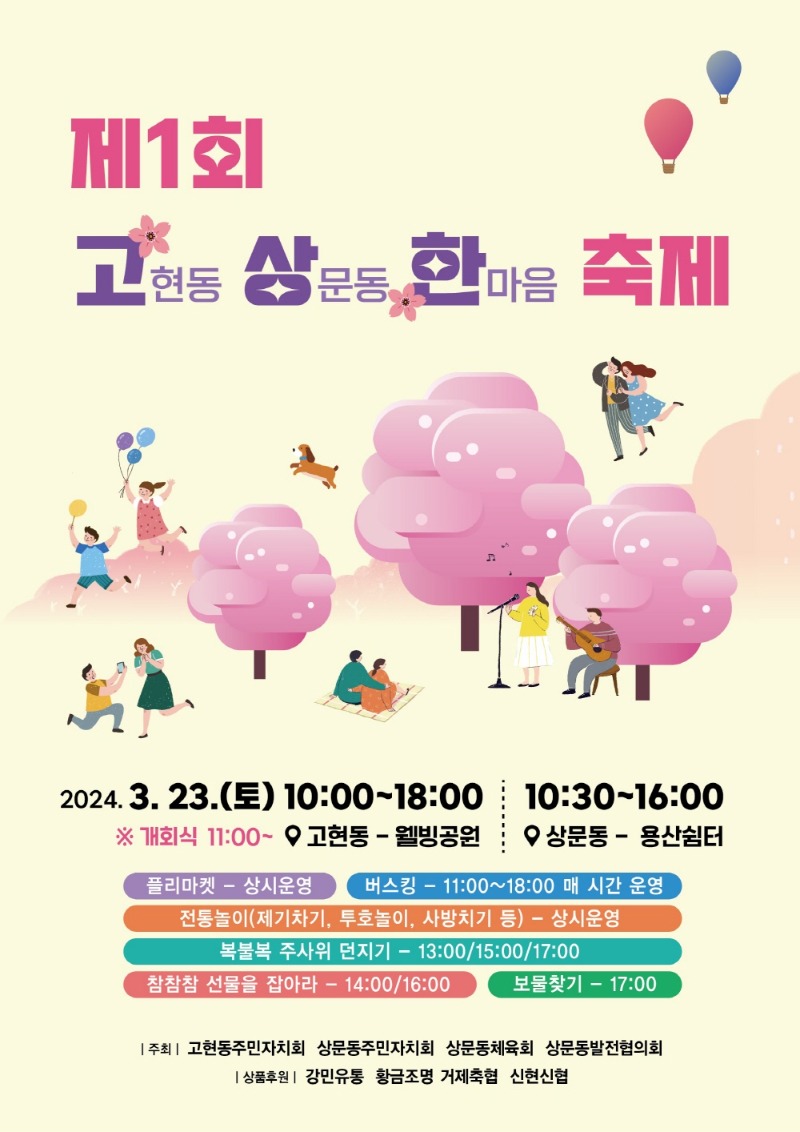 고현동 주민자치회는 오는 23일 제1회 고상한 축제를 개최한다. 봄철 고현천변 아름다움을 널리 알려 지역 봄꽃 축제로 자리매김하고자 고현동-상문동 주민자치회가 함께 기획하였다.