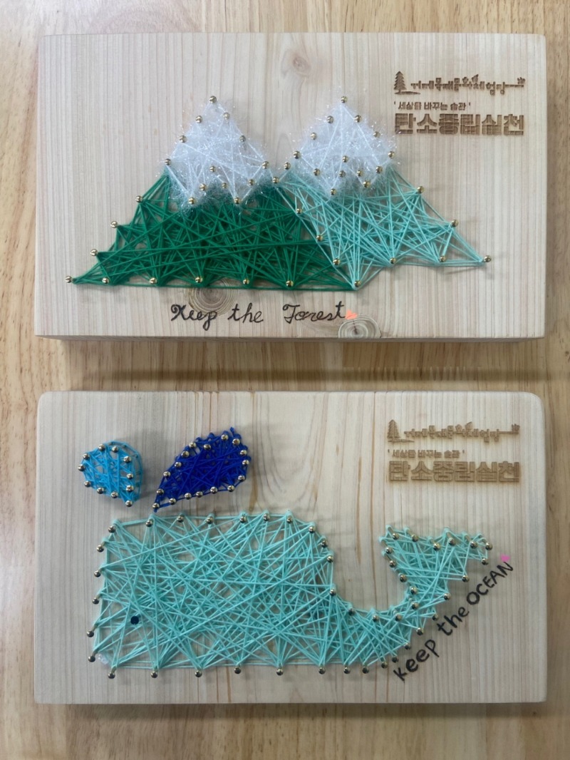 국제적 멸종 위기종인 나무(산), 고래, 벌을 주제로한 우드스트링 아트 체험은 거제 목재문화체험장에서 직접 재단한 국내산 편백나무 원목을 활용했다. 편백나무 원목에 ‘거제목재문화체험장’ 로고와 ‘세상을 바꾸는 습관 탄소중립실천’문구를 각인기로 새겨 제공되며, 체험자가 원하는 문구를 우드버닝으로 새길 수 있다. 단, 만 14세 미만 어린이의 경우 보호자의 지도 아래 우드버닝이 가능하다.