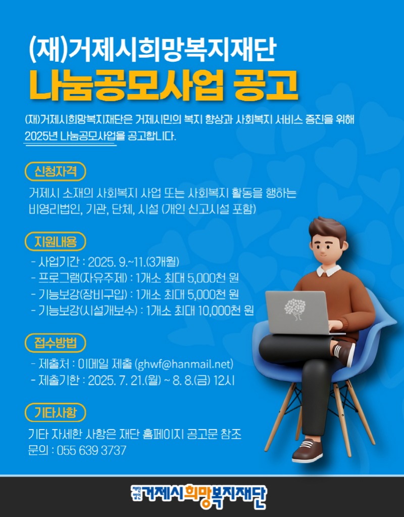 한편, 2025년 나눔공모사업과 관련한 자세한 사항은 거제시희망복지재단 홈페이지(http://www.gjchwf.or.kr/) 공지사항을 참고하면 된다.