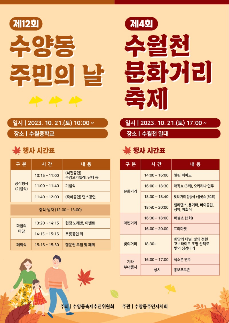 수양동축제추진위원회(위원장 이경호)는 오는 21일 토요일 “제12회 수양동 주민의 날” 및 “제4회 수월천 문화거리 축제”를 개최한다.