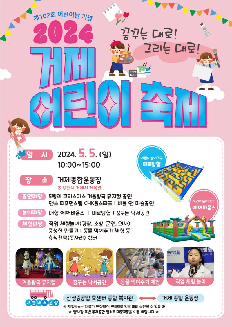 오는 5월 5일 제102회 어린이날을 맞아 ‘꿈 꾸는 대로! 그리는 대로! 거제어린이축제’가 거제시종합운동장에서 개최된다.