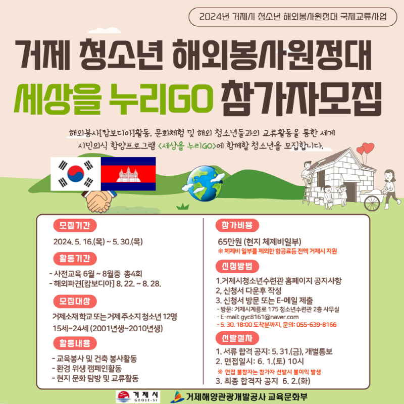 이번 국외 봉사 활동은 ‘거제 청소년 해외 봉사 원정대 세상을 누리고(GO)’란 이름으로 오는 8월 22일부터 28일까지 5박 7일간 캄보디아에서 이뤄진다.