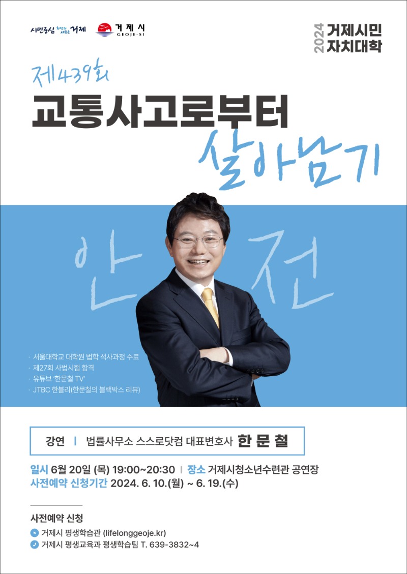 거제시(시장 박종우)가 6월 20일 거제시청소년수련관에서 법률사무소 스스로닷컴 대표 변호사 한문철을 초청해 ‘제439회 거제시민자치대학’을 개최한다고 밝혔다.